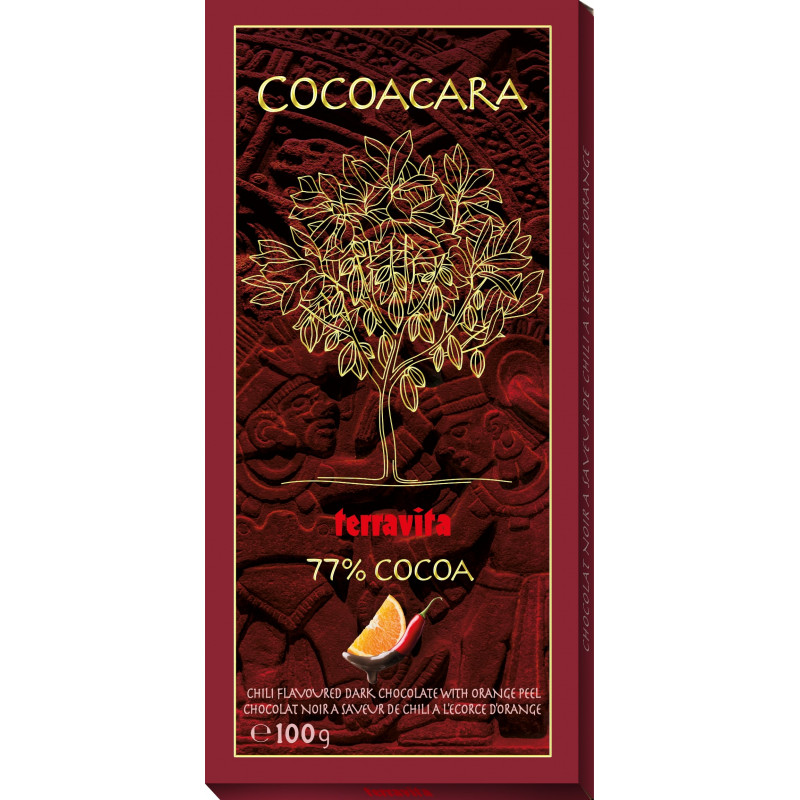 Chocolate Terravita melts in your mouth! A chocolate bar is not only a delicious dessert, but also a perfect gift for everyone. Bitter chocolate Terravita chili flavor with orange peel 100g with cocoa content of 77%.